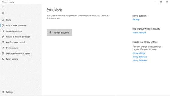 Go to Start > Settings > Update & Security > Windows Security > Virus & threat protection. Under Virus & threat protection settings, select Manage settings, and then under Exclusions, select Add or remove exclusions. Select Add an exclusion, and then select from files, folders, file types, or process.